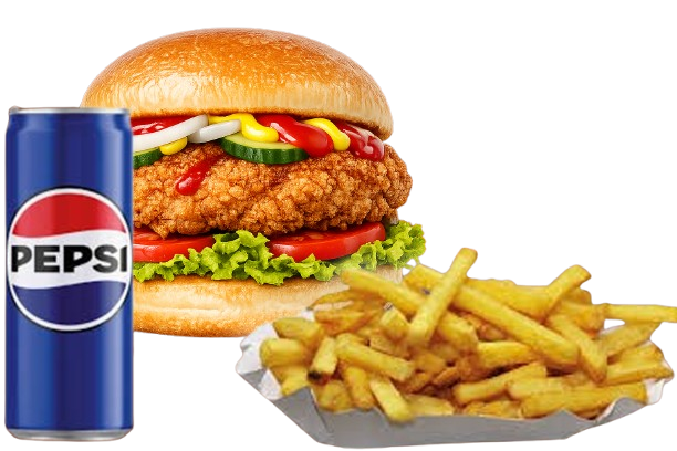 (Hamburger buci, rántott csirkemell, saláta, paradicsom, uborka, lila hagyma, ketchup, mustár, választható krumpli, üdítő)