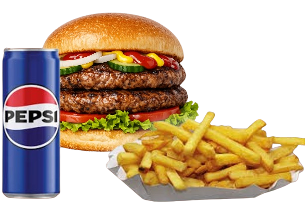(Hamburger buci, 2 db házi készítésű húspogácsa, saláta, paradicsom, uborka, lila hagyma, ketchup, mustár választható krumpli, üdítő)