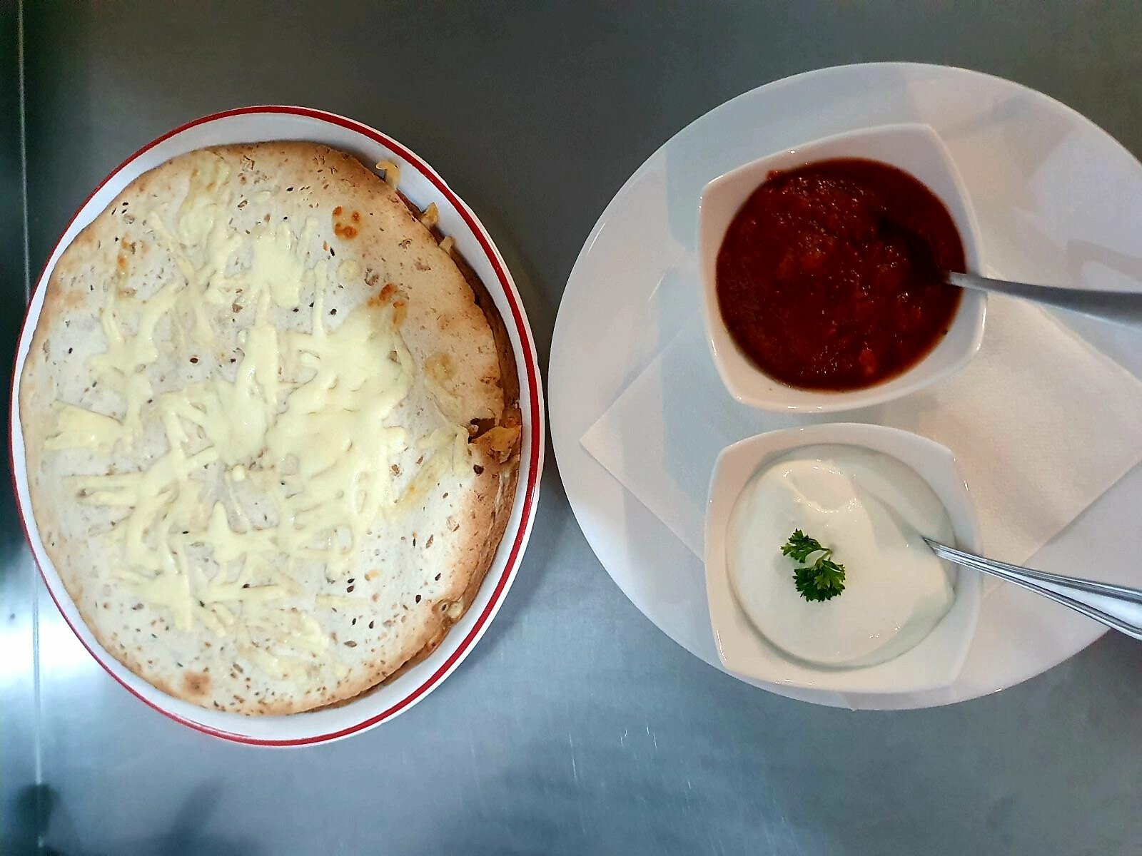 (fűszeres csirkemell, sajt duó, paradicsom salsa, tejföl)