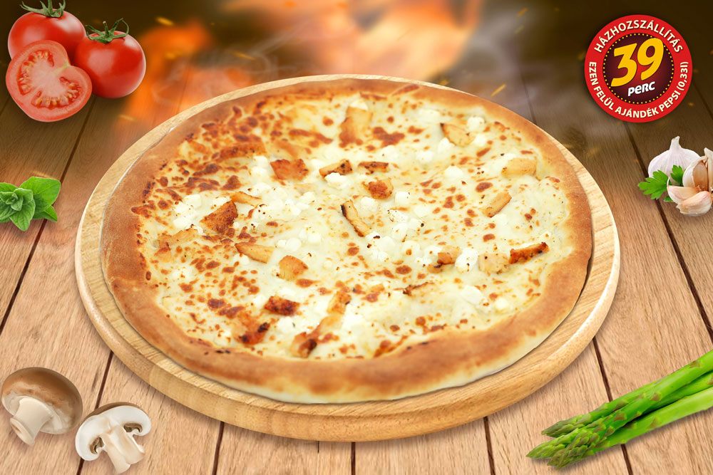 ((fokhagymás-tejfölös alap, csirke, sonka, juhtúró, mozzarella))