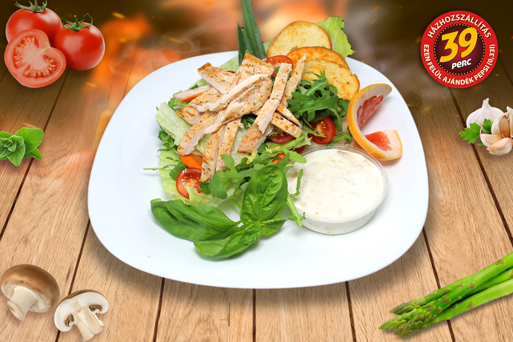 (friss saláta, sárgarépa, koktélparadicsom, csirke, toast, cézár öntet, Bake Rolls kenyér))