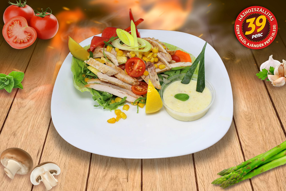 (friss saláta, sárgarépa, koktélparadicsom, fûszeres csirke csíkok, ananász, kukorica, tartár, Bake Rolls kenyér-))