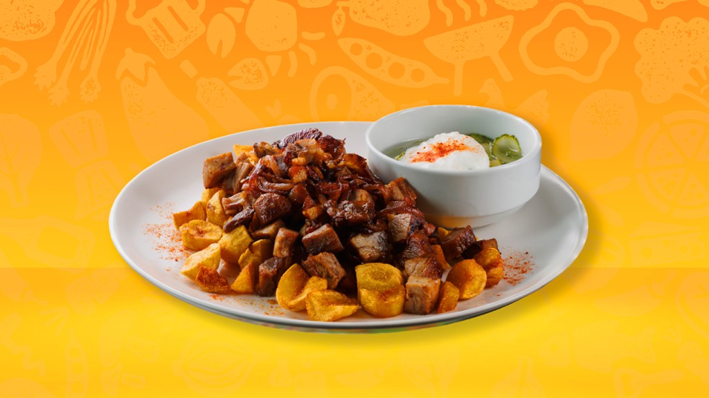 (kockázott sous vide tarja (200 gr), parázsburgonya, fokhagyma, bacon kocka, )