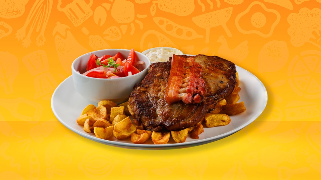 (tarja steak, (200gr) fokhagyma, pirospaprika, rántott hagymakarika, kakastaréj szalonna, )
