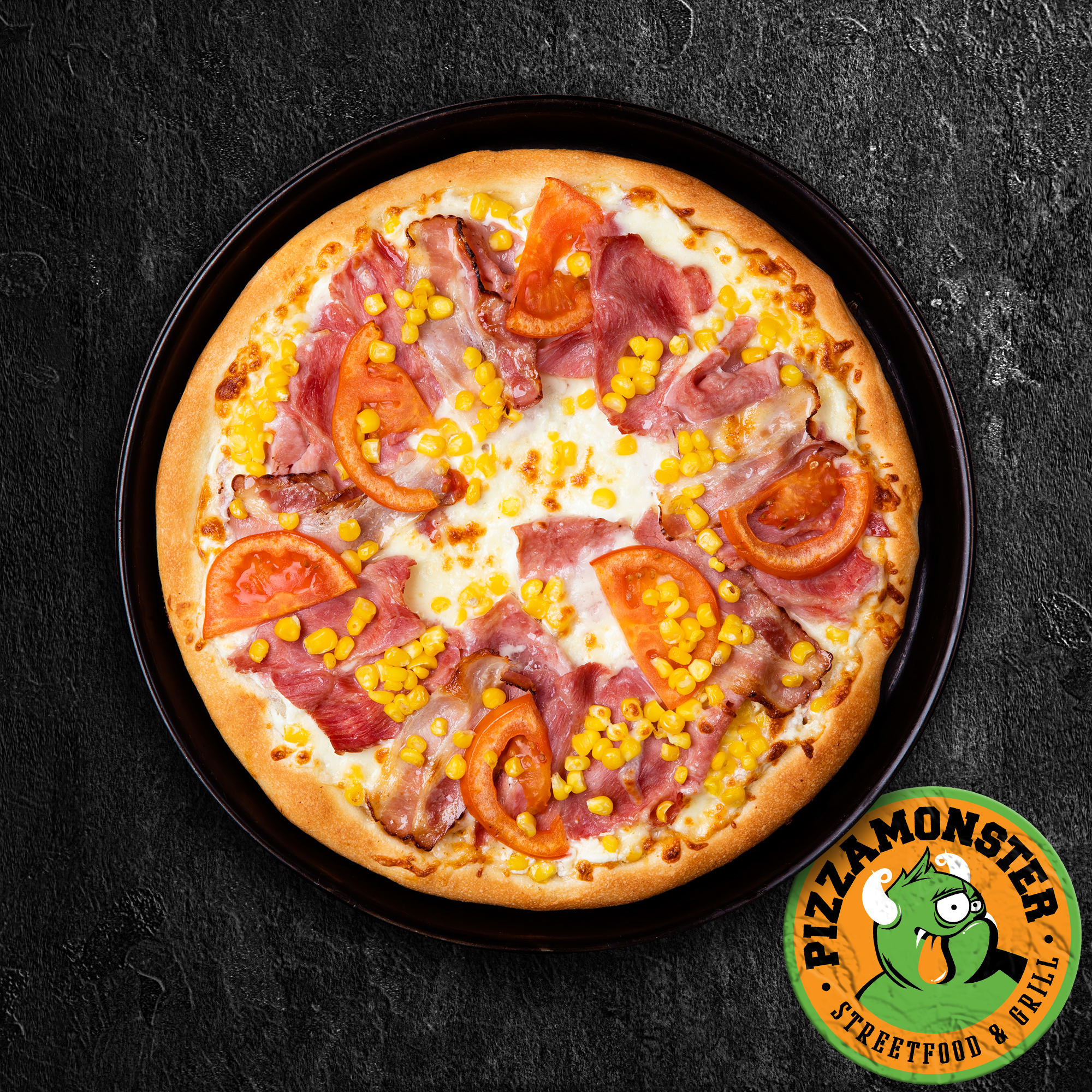 (sajtkrémes alap, sonka, bacon, tarja, kukorica, paradicsom, mozzarella)