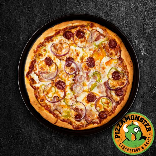 (paradicsomos alap, bacon, kolbász, lila hagyma, csípős paprika, füstölt sajt, mozzarella)