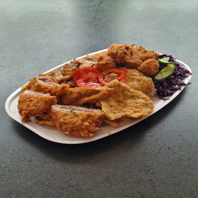 (cigánypecsenye - rántott sajt - rántott gomba - sajttal-sonkával töltött sertésborda - párizsi csirkemell - vegyes köret)