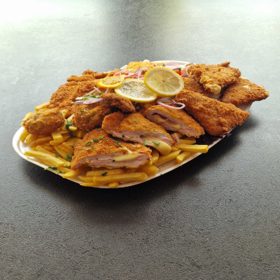 (cigánypecsenye - rántott sajt - rántott gomba - sajttal-sonkával töltött sertésborda - párizsi csirkemell - rántott csirkemell - vegyes köret)