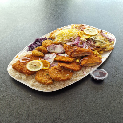 (supreme sertésszelet - mátrai borzaska - rántott gomba - sajttal-sonkával töltött sertésborda - cigány pecsenye - füstölt tarjával töltött trappista - bécsi szelet - rántott camamber - vegyes köret)